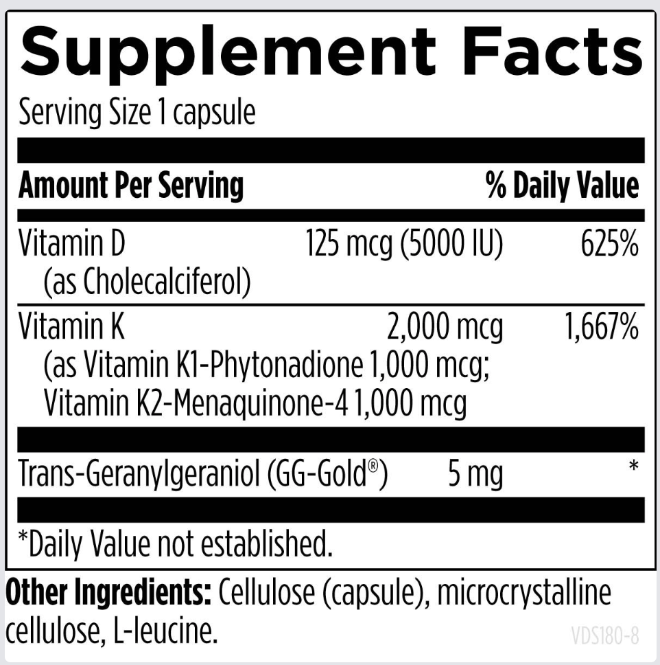 AgeWell Vital D+K provides clinically useful amounts of vitamin D3 and vitamin K (both K1 and K2 [as MK-4]), along with geranylgeraniol (GG), a substance produced naturally in the body, to promote optimal bone and arterial health and to maintain the immune system in proper balance.* The amount of vitamins D and K in this formula may be beneficial for those who do not receive adequate sun exposure and/or dietary sources of these vitamins. Vitamins D and K work synergistically, thus, increasing vitamin D increases the need for vitamin K.